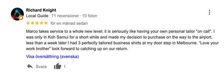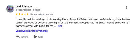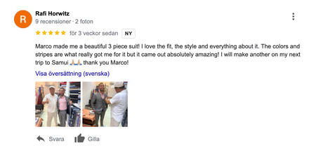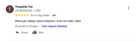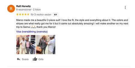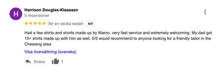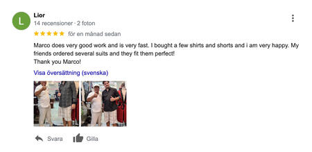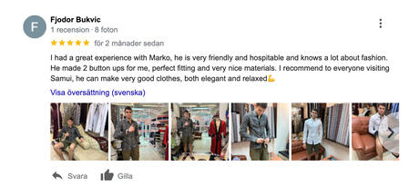 Introducing Marco, the master tailor and designer who's all about crafting the perfect look for you. Here's a glimpse into what he does best:Custom Tailoring: Marco specializes in crafting made-to-measure clothing that fits like a dream.Unique Designs: With his creative flair, Marco designs everything from suits and shirts to pants, dresses, coats, and vests.Attention to Detail: Every stitch is carefully placed, reflecting Marco's dedication to perfection.Personalized Service: Marco takes the time to understand your style preferences, ensuring each piece is tailored to your unique taste.Exceptional Quality: From fabric selection to finishing touches, Marco only delivers the finest craftsmanship.Customer Satisfaction: Above all, Marco values making sure you feel incredible in his creations, providing unparalleled service every step of the way.With Marco, it's not just about clothing, it's about bringing your style vision to life with precision, care, and a touch of designer magic.